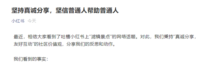 最近,相信大家看到了吐槽小红书上“滤镜景点”的网络话题。对此,我们秉持“真诚分享,友好互动”的社区价值观,分享我们的反思和动作。