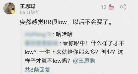 10月11日下午,王思聪“空降”到劳斯莱斯的评论区,直接留言:“突然感觉RR(劳斯莱斯)很low,以后不会买了。”