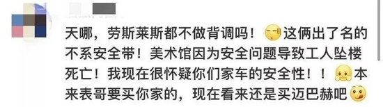 有网友进一步指责劳斯莱斯的失职:“劳斯莱斯都不做背调的吗,这俩出了名的不系安全带!美术馆因为安全问题导致工人坠楼死亡!我现在很怀疑你们家车的安全性!!”