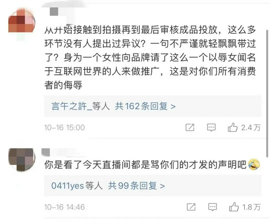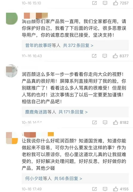 “从开始接触到拍摄再到最后审核成品投放,这么多环节没有人提出过异议?一句不严谨就轻飘飘带过了?请了这么一个以辱女闻名于互联网世界的人来做推广,这是对所有消费者的侮辱。”“润百颜你们家产品我一直用,我们全家都在用,请你保护好自己,我看了下后面的评论,很多恶意误导用户,你的诚意态度我已接受,坚决支持!”“让我说你什么好呢润百颜?知道国货难,知道你能做起来不容易,可你为什么要发生这样的事?作为老粉我可以原谅你,但心里这道坎儿真的让我挺难受的,好好解决处理问题,好好反思,好好做你的产品,其他少碰。”在润百颜道歉微博下,有并不买账的网友,也有选择原谅的网友。其实,利用明星效应或博主流量提高品牌关注度,是很正常的品牌营销行为,但在某种程度上,代言人是品牌商选取的与用户沟通的“人格形象”。代言人的形象和品牌形象是互相作用和影响的。品牌营销需谨慎,希望此次事件也为其他品牌敲响警钟。
