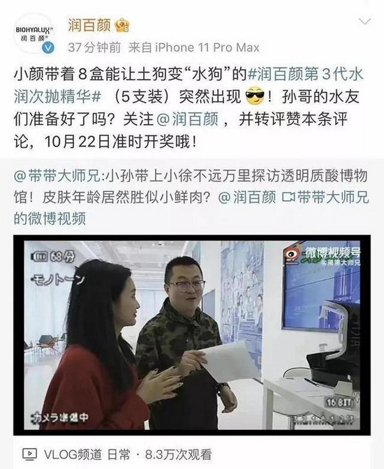 原来,10月15日,润百颜发布一条微博,宣传其产品让“土狗变水狗”,并转发网红“带带大师兄”孙笑川的微博视频。在这条长达15分钟的视频中,“带带大师兄”探访了润百颜公司的博物馆。