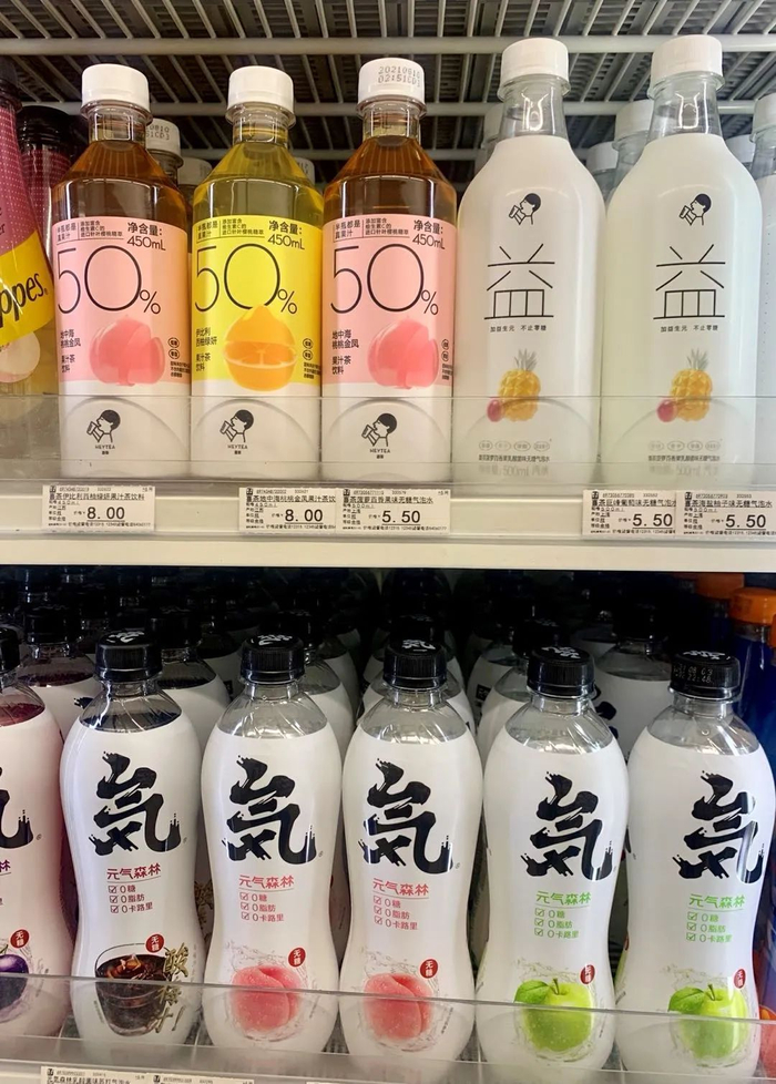 便利店展柜里,今年上市的喜茶瓶装气泡水和元气森林均在核心区域摆放