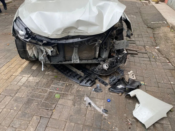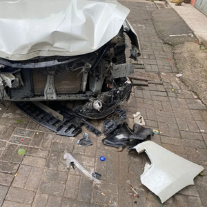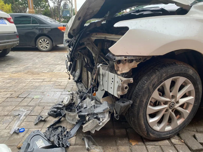 高先生提供的照片显示,他的日产轩逸引擎盖部分位置被撞至向上凸起,保险杠和防撞梁均受损明显或脱落,车头部位多个零部件散落。