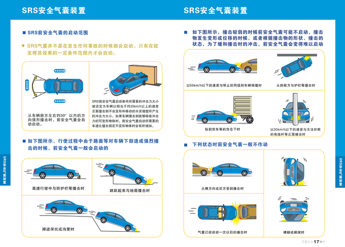 安全气囊会弹出的条件方面,包括“从车辆前方左右约30度以内的方向强烈撞击时,前安全气囊会自动启动”“高速行驶中与防护栏等撞击时”等。安全气囊不会弹出的情况方面,包括“以50km/h以下的速度与停止的同级别车辆相撞时”“钻到货车等的货仓下时”等。