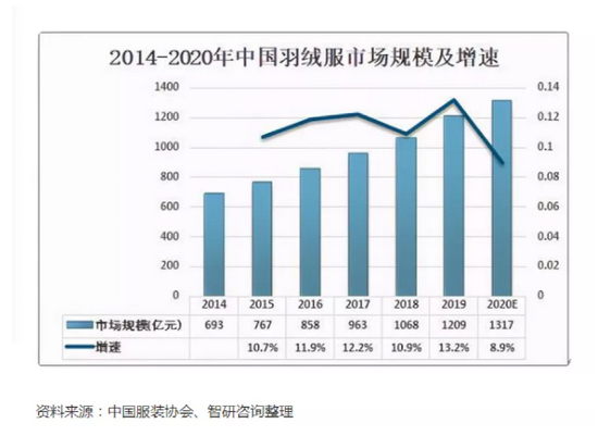 其实,自2014年以来,我国羽绒服的市场规模一直在不断增长。