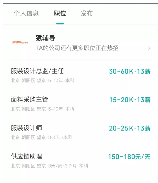 而在Boss直聘平台,猿辅导也挂出了服装设计师的岗位招聘,根据职位要求,猿辅导希望能招聘到有5年以上服装设计经验、熟悉全环节流程的服装设计专业人才。