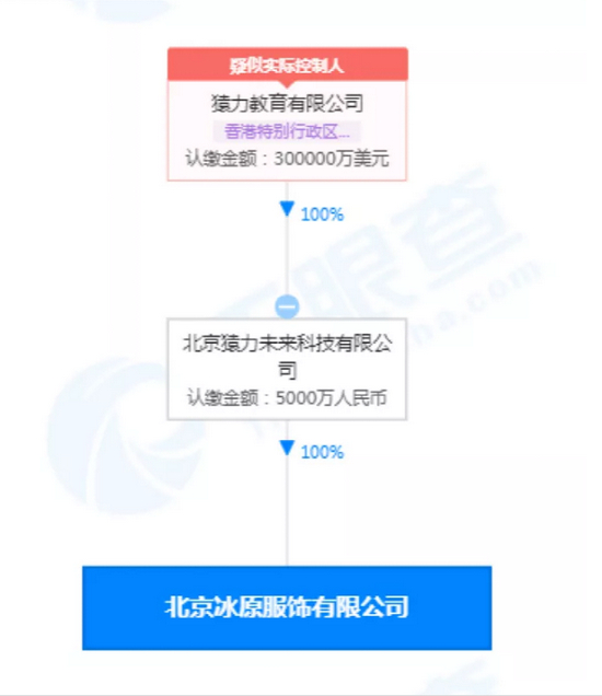 天眼查显示,猿辅导教育通过北京猿力未来科技有限公司,全资控股北京冰原服饰有限公司。