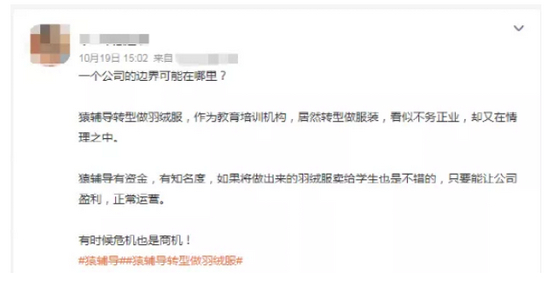 有网友认为,猿辅导卖羽绒服看似不务正业,但又在情理之中。猿辅导有资金和知名度,如果将做出来的羽绒服卖给学生也是不错的。有时候危机也是商机。