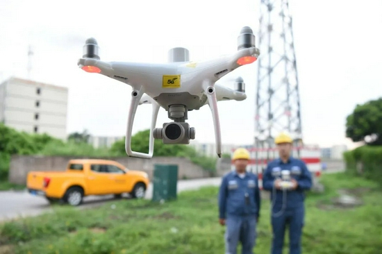 南方电网首创“数字电网”的发展新思路,图为供电人员对装有5G信号的无人机进行自动巡线调试。