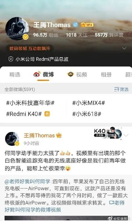 小米产品总监王腾在这则视频微博下方评论道:同学动手能力太强了,视频里有出境的那个白色智能追踪充电的无线底座好像是我们前两年做的产品,能帮上忙很荣幸。语气和表情将阴阳怪气的氛围拉满,与此同时在外界看来这个表态也“锤了底座来自小米”的猜想。