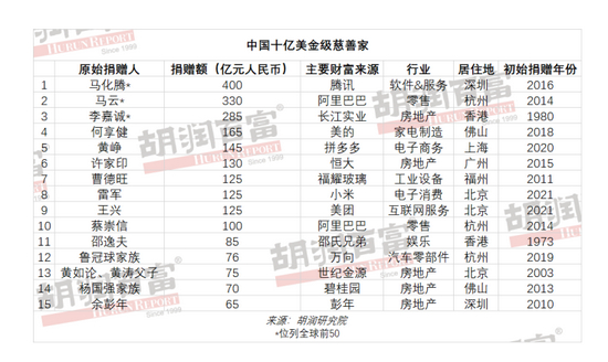 15位中国慈善家在最近100年都捐出了10亿美金以上,其中12位在世,3位已去世。马化腾以400亿捐赠总价值位列第一,其他还有曹德旺、何享健、鲁冠球、邵逸夫,以及中国裸捐第一人余彭年等