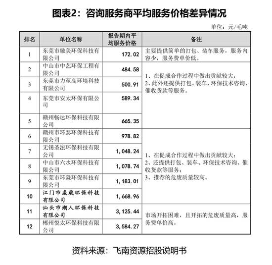 从图表2可看出,飞南资源不同咨询服务商报告期内的平均服务价格差异较大,从172.02元/毛吨到3584.27元/吨,相差近20倍。通常而言,危废品即使品类不同,价格差异也不应如此巨大。