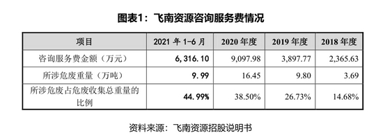 此模式实质上为飞南资源通过咨询服务商向产废单位采购原材料。招股书显示,飞南资源通过咨询服务商采购的金额及占比着实不小,2018—2021年上半年,该公司以咨询服务费为名义的采购费用分别为2365.63万元、3897.77万元、9097.98万元、6316.1万元,所涉危废占收集总量的14.68%、26.73%、38.5%、44.99%,不仅金额快速提升,且占比越来越高,飞南资源越来越依赖通过咨询服务商采购原料。