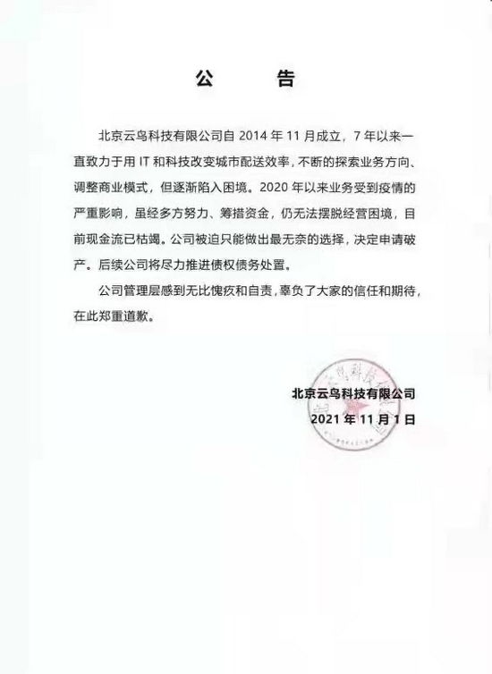 11月1日,一份由云鸟科技的运营主体北京云鸟科技有限公司发布的公告在网络流传。公告称,由于2020年以来业务受到疫情的严重影响,目前现金流已枯竭,“公司被迫只能做出最无奈的选择,决定申请破产。”
