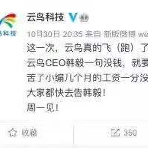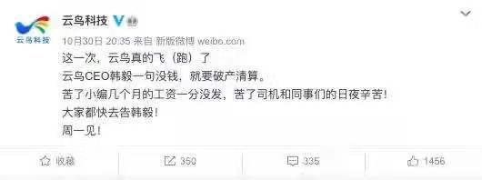 早在10月30日,云鸟科技官方微博就已公开发文“声讨”云鸟科技CEO韩毅,称已拖欠员工几个月工资,并表示“大家都快去告韩毅!”