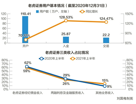 公开信息显示,近年来老虎证券的开户用户数、入金用户数、交易用户数等指标均实现了快速增长。截至2020年12月31日,公司拥有开户用户数110.41万,入金客户数25.87万,交易用户数22.2万,同比分别增长70.12%、128.53%、124.47%。截至2021年上半年,老虎证券拥有账户用户数164.9万,为2020年同期的2倍;入金用户数52.91万,其中二季度单季新增入金用户数15.3万,环比增长30.4%,且超六成来自海外。得益于入金用户数快速放量,近年来,老虎证券的营业收入呈快速增长势头。据老虎证券发布的2021年中报,2021年上半年公司实现营业总收入同比大幅增长166.1%至1.42亿美元。具体而言,在业务模式上,目前公司业务以经纪佣金收入为主。2021年上半年,老虎证券经纪佣金收入、两融利息及金融服务收入、其他业务收入分别占总营收的59%、26%、15%(2020年同期为62%、29%、9%)。