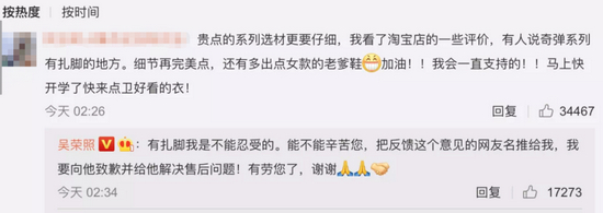 鸿星尔克董事长吴荣照也意识到了鸿星尔克质量方面的缺陷,试图树立起品牌的质量口碑。有网友在他账号下反映“有人说奇弹系列有扎脚的地方”,吴荣照回复“有扎脚我是不能忍受的”,并表示“要向他致歉并给他解决售后问题”。
