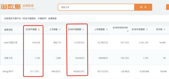 鸿星尔克今年的财务状况可以从淘系数据一窥端倪。红星资本局注意到,截至11月2日,近30天内鸿星尔克的淘系销售额仅为李宁的约1/4。淘数据提供的天猫平台数据显示,近30天内,鸿星尔克品牌销量合计约62万,销售额计1.16亿元;李宁品牌销量合计约312万,销售额计4亿元。