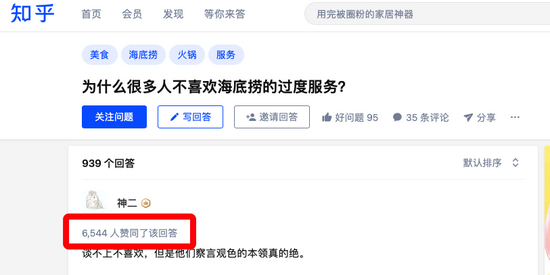 而在知乎上,一则关于“为什么很多人不喜欢海底捞的过度服务?”帖子中,更是有数千人对类似遭遇表示了赞同。
