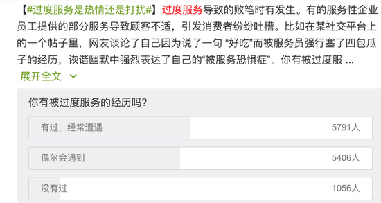 在更早期的一份微博调查中,有5000余人表示“经常遭遇过度服务”。
