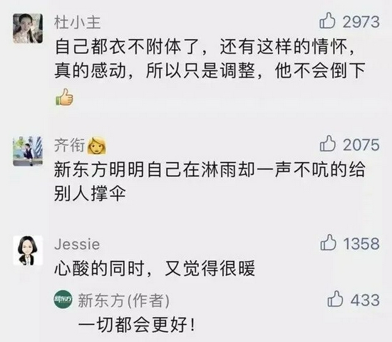 如今新东方正面临“至暗时刻”,俞敏洪表示:“大家都知道,最近有人不断给我发问候信息,因为教育领域正在进行变革,大家担心我会心情不好,其实我告诉他们,我的心情一点都没有不好,甚至某种意义上处于一种心平气和的状态,理由也非常简单,因为所有这一切教育领域的变革,都不会影响我对自己人生大方向的设定,它不会影响我希望自己的人生能够更多地帮助到需要帮助的人的目标。”