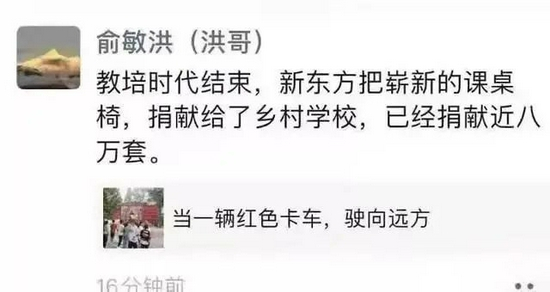 11月4日,新东方董事长俞敏洪在社交平台发布动态称:“新东方业务调整,为农村孩子捐献近八万套课桌椅。”