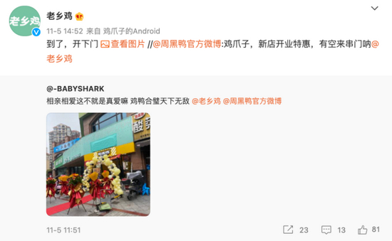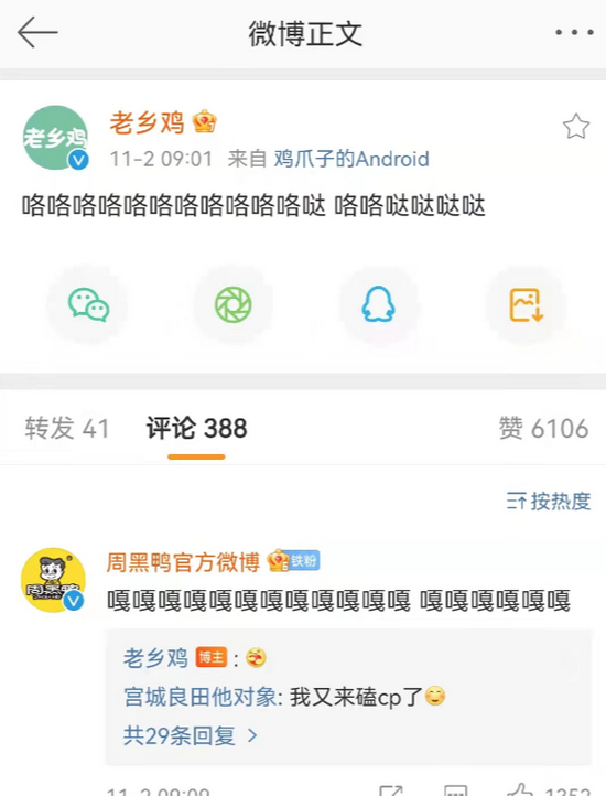 微博评论下大批网友表示想辞职去老乡鸡上班,并且在“咯咯哒”的微博下面引来了一众食品企业慕名而来的评论,周黑鸭在老乡鸡微博下方留言“嘎嘎嘎嘎嘎”,五州牛肉留言“哞哞哞哞哞”,卫龙留言“嗷嗷嗷嗷嗷嗷”,评论区异常热闹。