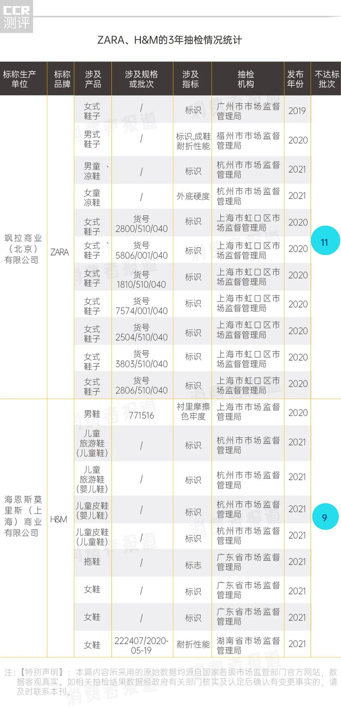 其中标称飒拉商业(北京)有限公司生产的“ZARA”的11批次鞋子被检出不达标。