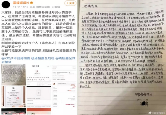 11日下午,一位自称用焉栩嘉身份证号买DR产品的当事人王某霏,通过微博账号“霍嚯嚯嚯hl”发布道歉声明称,2018年自己在朋友圈看到黄牛发的明星身份证号顺手保存了,随后尝试用明星身份证号买戒指。