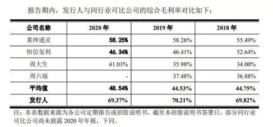 得益于迪阿股份长期以来对营销的重视,单价上万元的求婚钻戒也为公司带来了丰厚的毛利率。2018~2020 年,公司综合毛利率分别为 69.82%、70.21%、69.37%,每年接近 70% 的毛利率与同行业可比公司莱绅通灵、恒信玺利、周大生、周六福相比,平均高出 20~30 个百分点(如下图)。