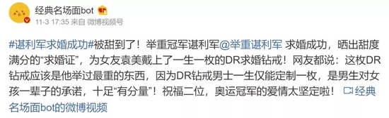 2016年11月,许昕在杨宗纬演唱会上用DR求婚;17年5月,吴敏霞老公用DR求婚;17年10月,苏炳添在婚礼上与妻子交换了DR的婚戒。