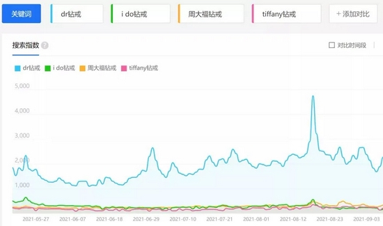 在百度指数中同时比较近半年来几家大众品牌钻戒的搜索热度,你会发现DR的热度一骑绝尘。