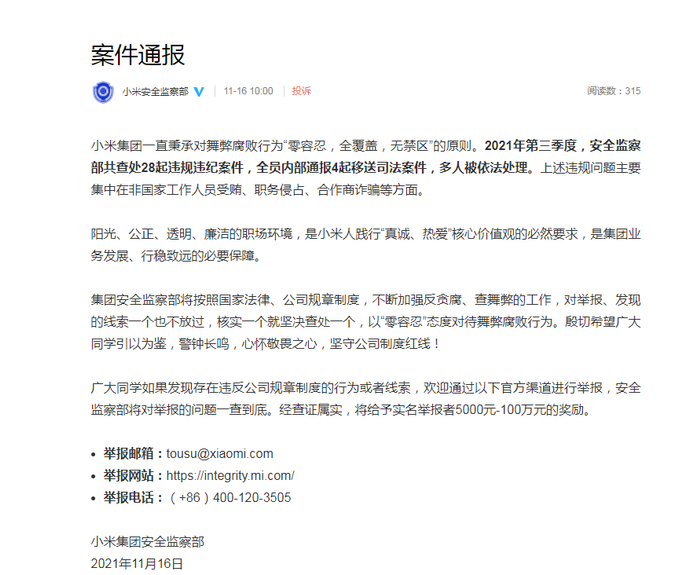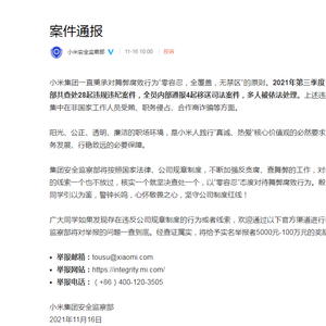 据小米安全监察部微博11月16日消息,小米集团一直秉承对舞弊腐败行为“零容忍,全覆盖,无禁区”的原则。2021年第三季度,安全监察部共查处28起违规违纪案件,全员内部通报4起移送司法案件,多人被依法处理。上述违规问题主要集中在非国家工作人员受贿、职务侵占、合作商诈骗等方面。