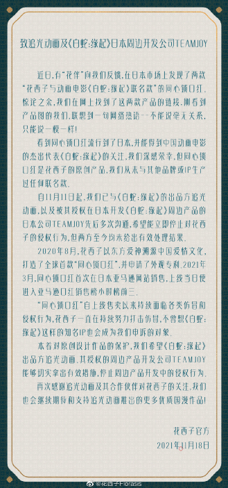 11月18日,国货美妆品牌花西子在官方微博发布声明,表示追光动画旗下知名动画电影《白蛇:缘起》及其在日本授权的IP开发公司TEAM JOY涉嫌抄袭花西子产品“同心锁口红”。
