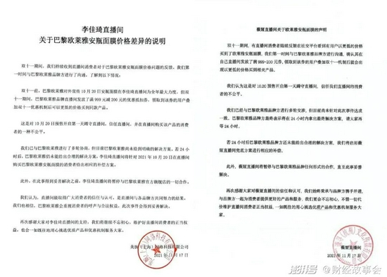 最终,李佳琦、薇娅于11月17日,先后发表声明:一,如若欧莱雅在24小时以内未给出解决方案,李佳琦、薇娅直播间将对消费者进行兜底赔偿;二是在事情未得到妥善解决之前,二人将暂停与欧莱雅集团的一切合作。