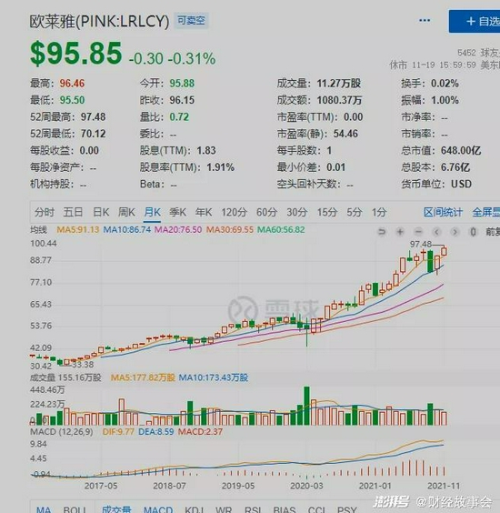但这并未影响欧莱雅在资本市场的价值,11月初至今,欧莱雅股价震荡中一路向上,截至11月17日11点50分,欧莱雅股价为97.23美元/股,刷新2020年以来的高位,最新市值为648亿美元。