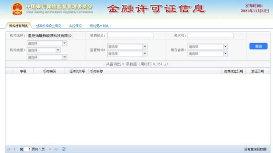 从照片上看,金融许可证的发证机构是“中国银行保险监督管理委员会温州银保监分局”,发证时间是2021年1月6日。但记者在中国银保监会的金融许可信息查询页面,未查询到相关信息。