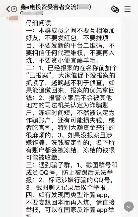 记者也注意到,在科e电之外,也有别的投资者反映,鑫e电等其他“e电家族”的App与科e电存在颇多相似之处。记者注意到,目前已有“鑫e电”投资者报案,并成立“受害者交流群”。