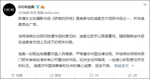 11月23日,DIOR官方微博(@DIOR迪奥 )发文,就摄影师陈漫争议作品《骄傲的矜持》进行回应。