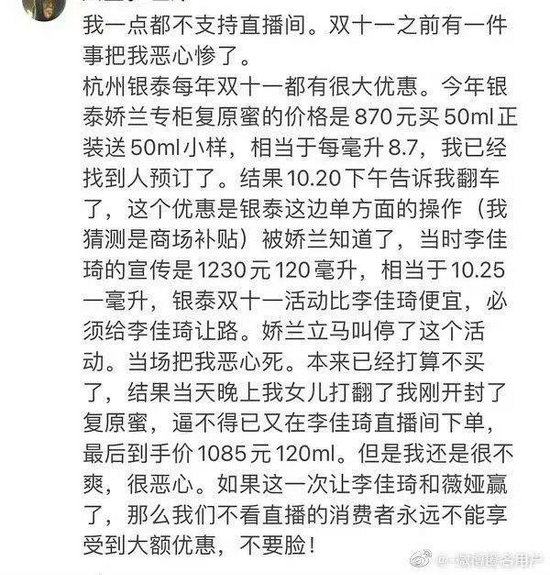 比如,近期的“欧莱雅事件”——李佳琦、薇娅与欧莱雅之间的火药味,从直播间蔓延到了场外消费者与网络舆论场,就在欧莱雅公开道歉当天,两则题为“天下苦直播久矣”的匿名投稿在微博上流传开来,内容抨击主播的“手也伸太长了”“搞垄断”,迄今为止,该微博已转发近5万次。