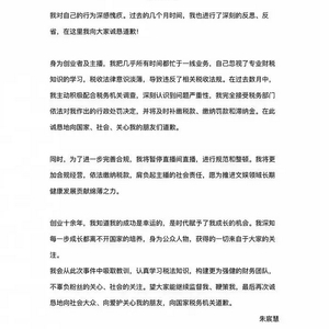 当天傍晚,雪梨与林珊珊分别在其个人微博发布致歉信,以几乎一模一样的格式和说辞,表示将及时补缴税金及罚款,同时暂停直播间直播,进行规范和整顿。