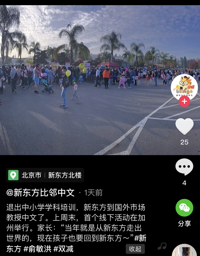 23日,@新东方比邻中文 发布视频展示了上周末在加州举办的首个线下活动,现场各个摊位前都挤满了乌央乌央的华人家长。视频文案中还提到,有家长表示“当年就是从新东方走出世界的,现在孩子也要回到新东方”。