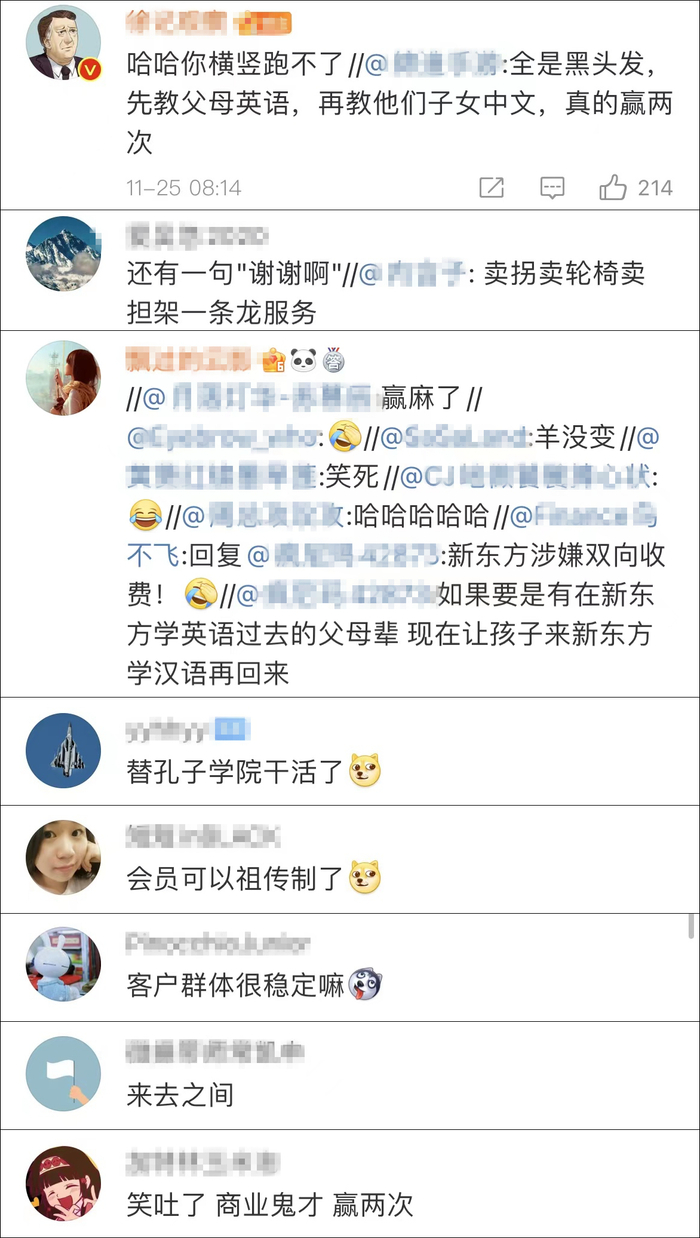 国内网友看到这一幕不由得笑出声,调侃道:“好家伙,当年爸妈在新东方学英语移民去美国,如今孩子在美国又回到新东方学中文,新东方这波是赢两次,‘双赢’。 ”