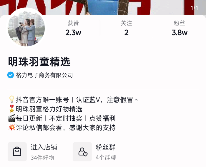 截至26日晚,该账号粉丝超3.6万,仅关注了“格力电器”抖音号和孟羽童个人抖音。同时,该账号关联了“GREE格力小家电旗舰店”,内有30余款格力产品。