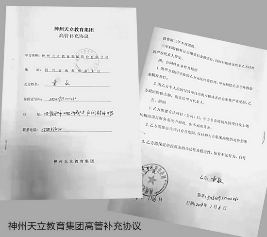 2017年1月,童敏以投资天立合作项目为由与王必珍(化名)签订协议,后者投入24万元,童敏则承诺每年底按利润分红。在高额分红利诱下,2018年12月23日、2019年1月19日,童敏与王必珍又签订了神州天立教育集团高管补充协议(资金组成及分红补充),王必珍追加投资420万元。