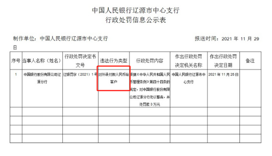 据央行官网11月30日公布的中国人民银行辽源市中心支行行政处罚信息公示表显示,中国银行辽源分行因对外误付假人民币给客户,央行辽源市中心支行依据《中华人民共和国人民币管理条例》第四十四条的规定,对中国银行股份有限公司辽源分行处以警告,并处罚款3万元,处罚日期2021年11月25日。