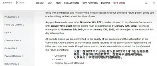 加拿大鹅官方网站显示,其在加拿大、美国、英国地区均有30天退货政策。由于圣诞假期,英美加地区于2021年11月8日或之后购买的任何商品,均可在2022年1月10日前退回至任何加拿大鹅店铺。这意味着,近期其消费者享受多达33天的退货政策。
