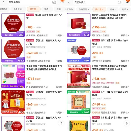 中新经纬注意到,在电商平台上,目前大部分在售的深红色包装的同仁堂安宫牛黄丸标价均已调整为860元。