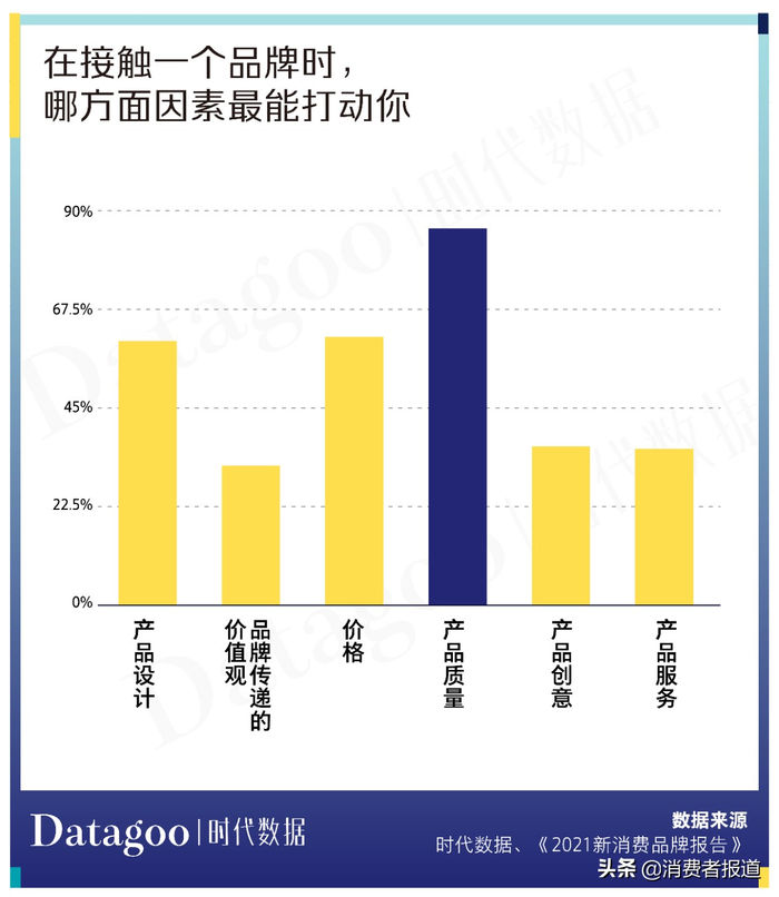 调查显示,在选择一件产品时,尽管品牌传递的价值、产品价格对年轻人来说也很重要,但86.6% 受访者表示产品质量是他们首要考量的因素。