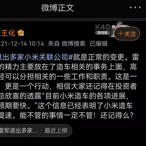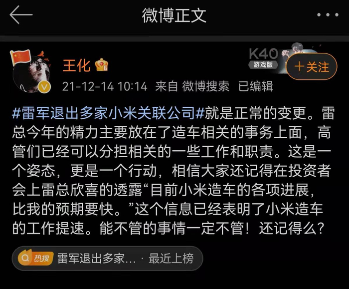 12月14日,小米公关总经理王化在微博回应“雷军退出多家小米关联公司”称,该行为是正常变更。